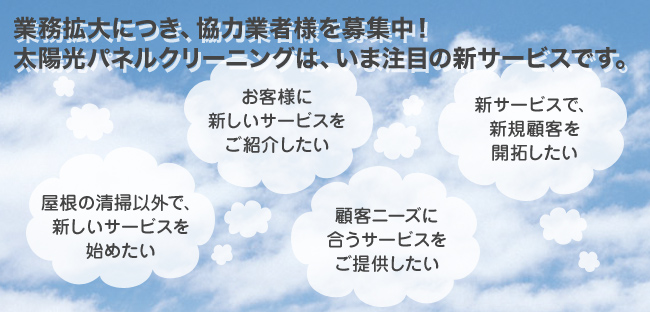 当社がご紹介している業務は、「太陽光パネルの清掃」という、まだ競合が少ないサービスです。クリーニングに必要な洗浄剤などはご提供いたしますので、すぐに新サービスを開始することが可能です。もちろん、作業方法についても丁寧にお伝えいたしますのでご安心ください。
